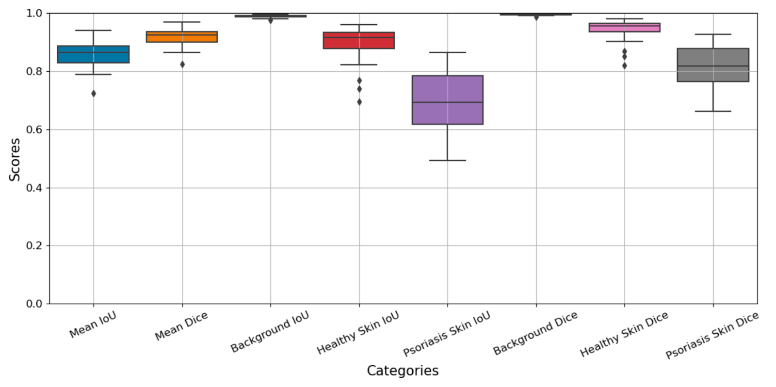 The drop-off for psoriasis segmentation is not surprising. Lesion boundaries in psoriasis are often gradual rather than sharp; erythema fades at the margins, scaling varies in density, and the transition from affected to unaffected skin can be ambiguous even to expert observers. Overall, the model performs well, considering this involves the most difficult cases.