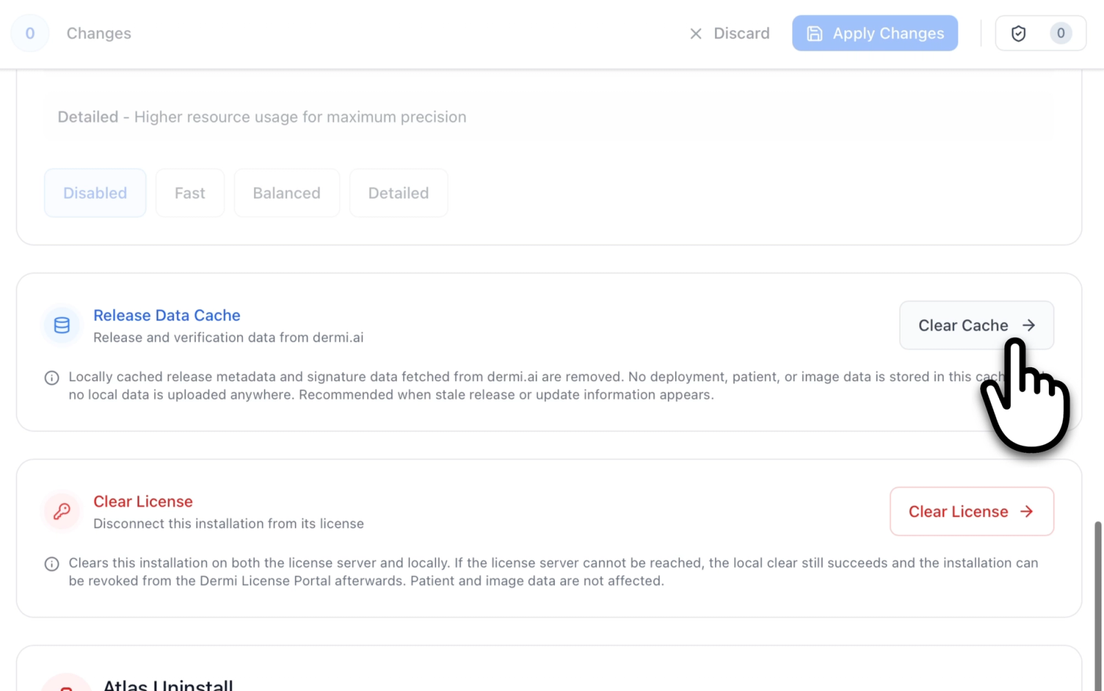 Dermi Atlas 26.2.2 introduces a license status alert, a Clear License action, and a Clear Release Data Cache action in Dermi Atlas Manager.