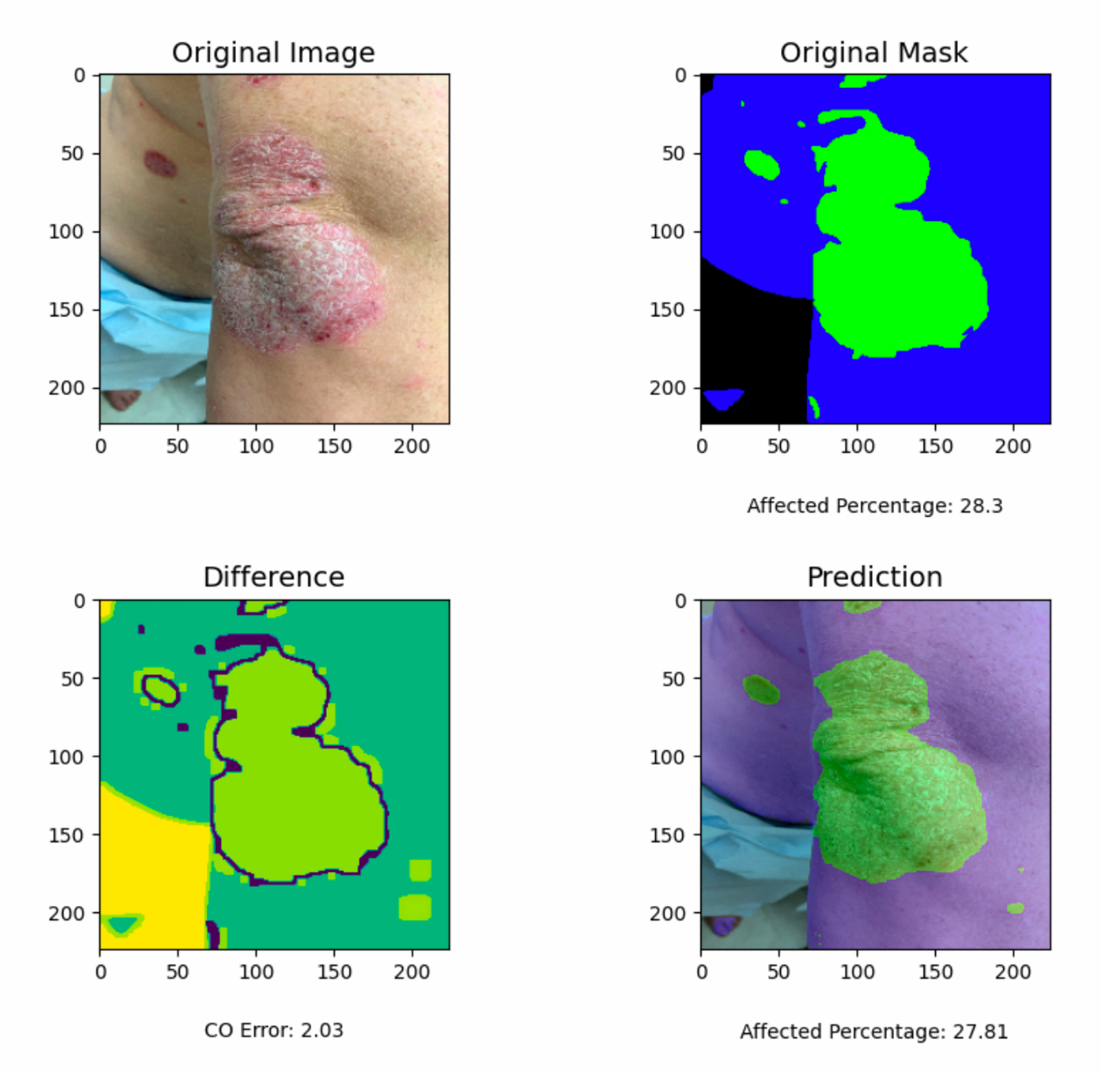 The ANN was a 17-layer convolutional neural network (CNN) built in Python with TensorFlow, accepting input images at 224×224 or 448×448 pixels. It had been trained on over 2,000 unaltered psoriasis photographs, each paired with a manually annotated mask outlining healthy versus affected skin. The network's job was conceptually simple: count the pixels classified as psoriasis, count the pixels classified as healthy skin, and compute the ratio. Despite this apparent simplicity, the task directly mirrors what clinicians attempt during physical examination, only with pixel-level granularity instead of gestalt estimation.